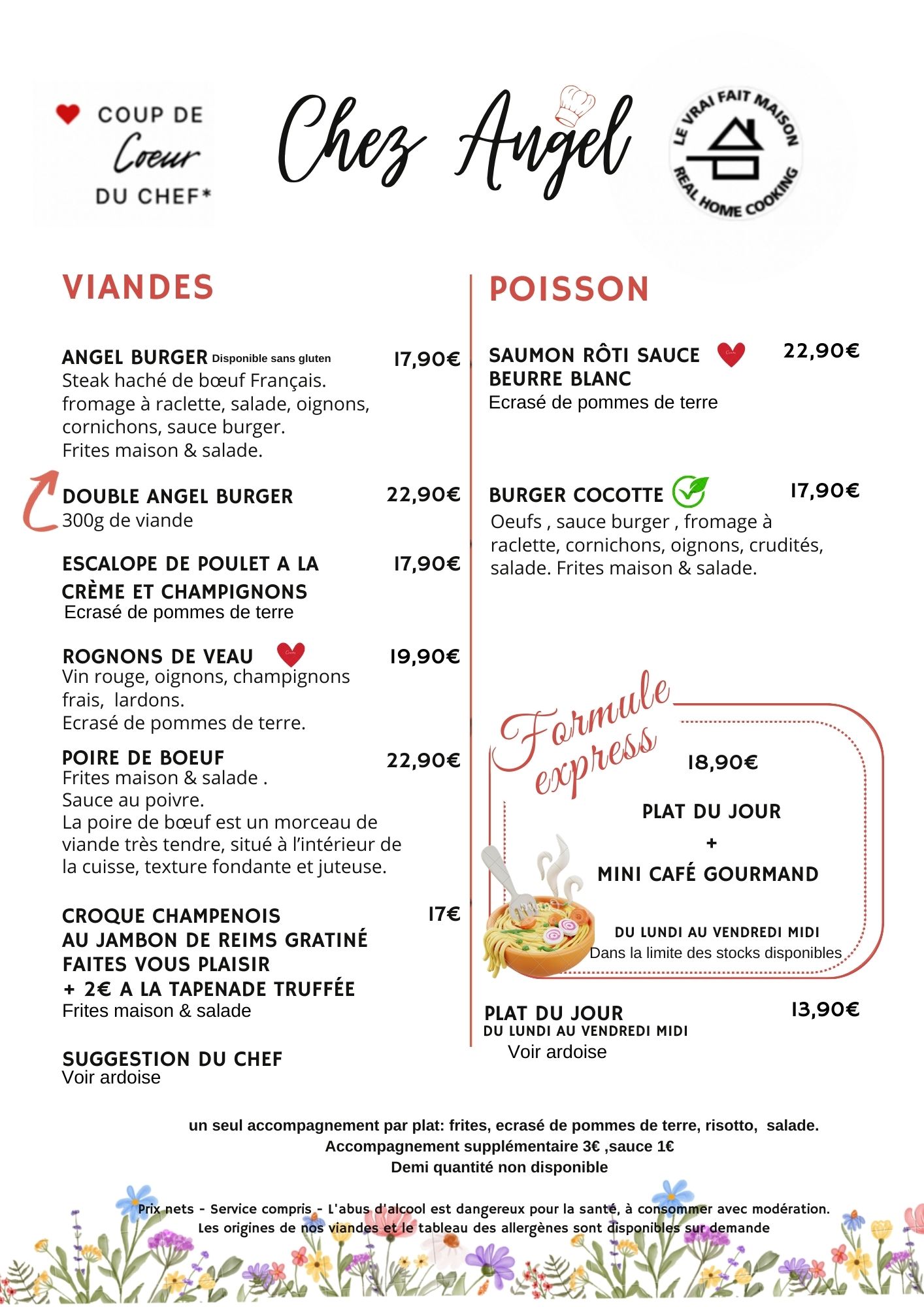 Venez déguster une cuisine gourmande et régionale, Chez Angel est le lieu idéal pour passer un agréable moment en famille, entre amis ou collègues.Nous serons ravis de vous accueillir dans une ambiance décontractée et de vous servir une cuisine faite maison .